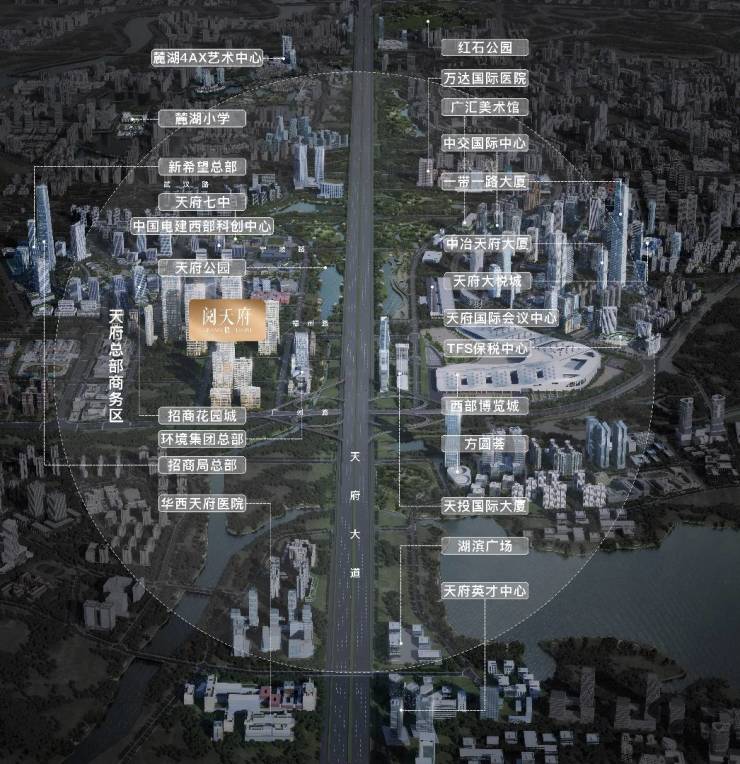 世界配套,资源中⼼。都会中央,万亩公园;繁华与⾃然同频以阅天府为中心,高能资源圈全维覆盖。