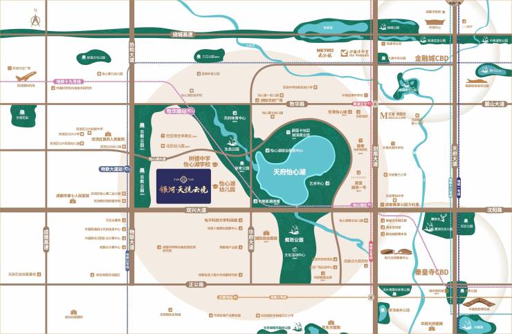 项目距双流机场约10km,距天府机场约45km,板块上承华府城市生活功能区,下启天府国际生物城和新津,西接双流航空港,东连天府新区、东部新区天府航空港。周边拥有着庞大而便捷的立体交通网络,机场轨道相互串联交替,“三横四纵三地铁”的立体交通路网可快捷通达全城和双机场。