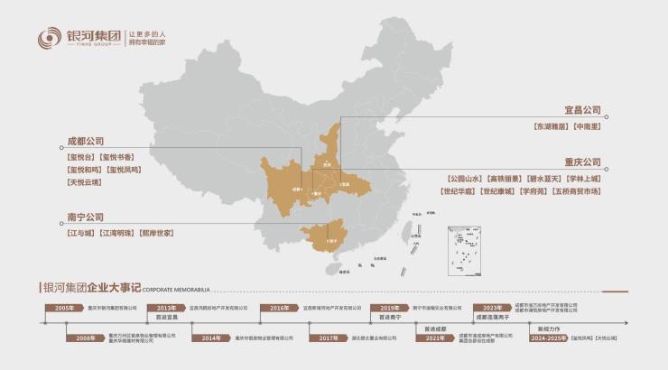 重庆银河集团创始于1985年,是一家历经41年发展沉淀的集团化公司,集“房地产开发、建筑施⼯、物业服务、商业贸易、商业运营”五⼤业务板块,全⾯开花。集团⽴⾜西南,呈现成都、重庆、南宁、宜昌多城市布局格局,⼗余盘、盘盘热销。
