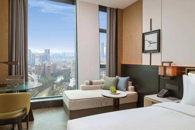 占据城市核心高点,东看339电视塔、龙泉山,西望西岭雪山,南瞰城市CBD天际线,北览城市中轴繁华。这种“推窗即见千年文殊院,对望IFS”的视野,正是高端酒店客房溢价的核心要素之一。