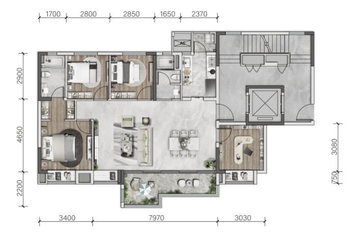 此户型是项目满足家庭全生命周期需求的进阶之选,升级为四室两厅两卫的宽敞格局。更大的空间尺度为多代同堂、二孩家庭或拥有独立居家办公区的需求提供了完美解决方案。它象征着对更从容、更完备家庭生活的追求,是注重空间功能性与未来成长性的青年家庭的进阶优选。