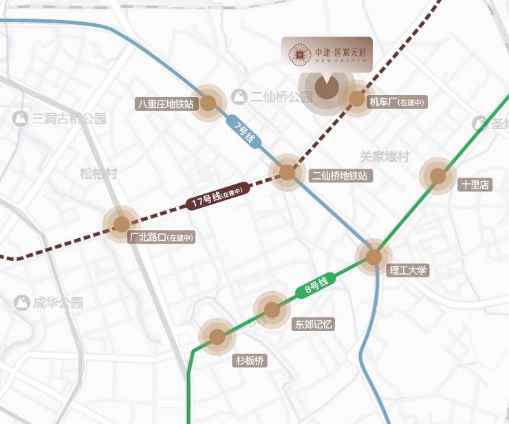 中建匠宸元启二八板块双轴交汇,近地铁 17 号线机车厂站与二仙桥 TOD。与成都七中英才学校一街之隔,周边商业体环伺,央企筑造 “产学风尚” 改善住区。