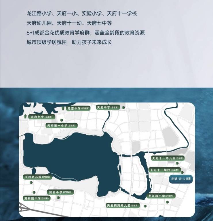 项目所在学区为天府新区E区小学、C区初中,周边环绕天府七中、天府中学等7所优质学府,形成"6+1"名校教育矩阵,为业主子女提供从幼儿园到高中的全龄段优质教育。