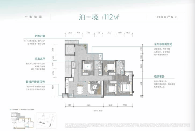 建面约112㎡高得房率四房作为项目的入门产品,在建面约112㎡的产权面积内,凭借超100%的实际使用率,可享功能齐全的四房格局,并拥有大方厅的阔绰感。该户型以极高的空间效率,为主城年轻改善家庭或精英人士提供了入驻核心板块的优质机会。