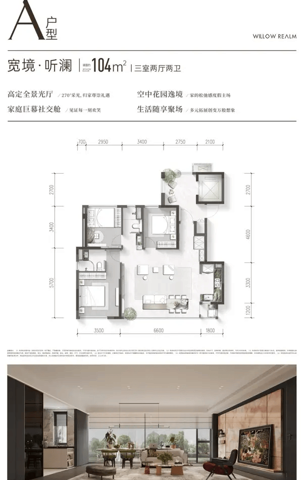主力户型104-143㎡现代阔景平层,标准层高3.05米(商业底层除外),专属电梯厅入户设计