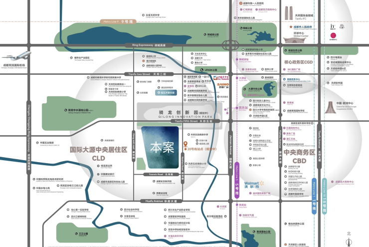 四纵(剑南/益州/天府大道+成渝环线)六横(天府1-5街+华府大道)路网骨架;双地铁覆盖(5号线民乐/大源站+规划20号线),30分钟通达主城核心区。