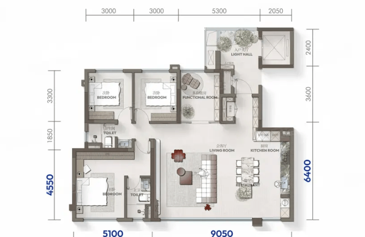 1、采用2梯2户纯板式设计,129-199㎡全系四房户型,满足不同家庭阶段的居住需求
