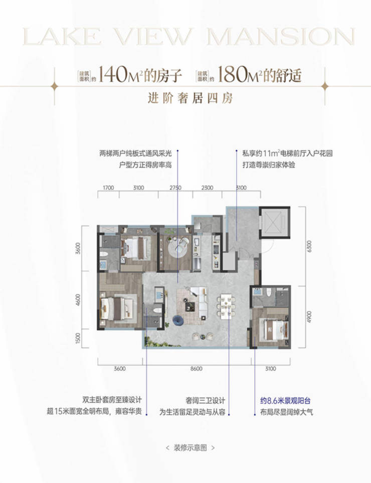 独立的电梯厅入户、私享入户花园、6.6米阔尺宽厅,8.4米景观阳台,版式通透、主卧步入式衣帽间+私密主卫,次卧均赠送飘窗,户型利用率高