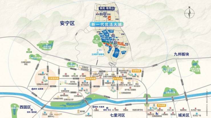 生态环境:安宁区依山傍水,位于黄河北岸,是兰州生态环境最佳的区域,保利领秀山背山面水,地处山之南水之阴的上风上水之地,可俯瞰整个安宁及七里河秀美景色,同时因为地势高于整个城市平面,空气污染极小,生态环境良好。本片区周边规划了多个公园和广场,在兰州植物园、天斧沙宫地质公园、仁寿山生态公园等生态公园的环伺下。