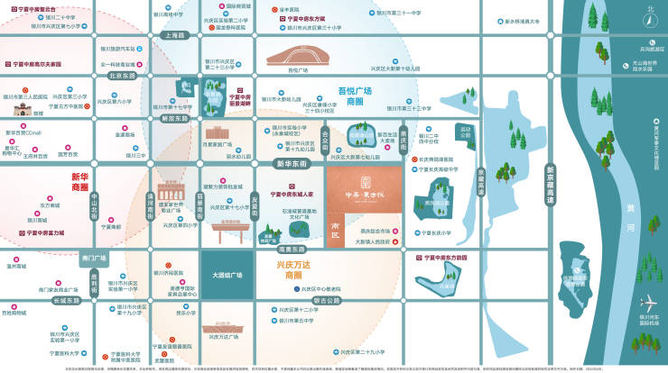 三大商圈联袂,共绘都市精致生活新蓝图,新华商圈、兴庆万达商圈、吾悦广场商圈,成就宁夏中房东方悦南区直线距离约1.5km生活半径。