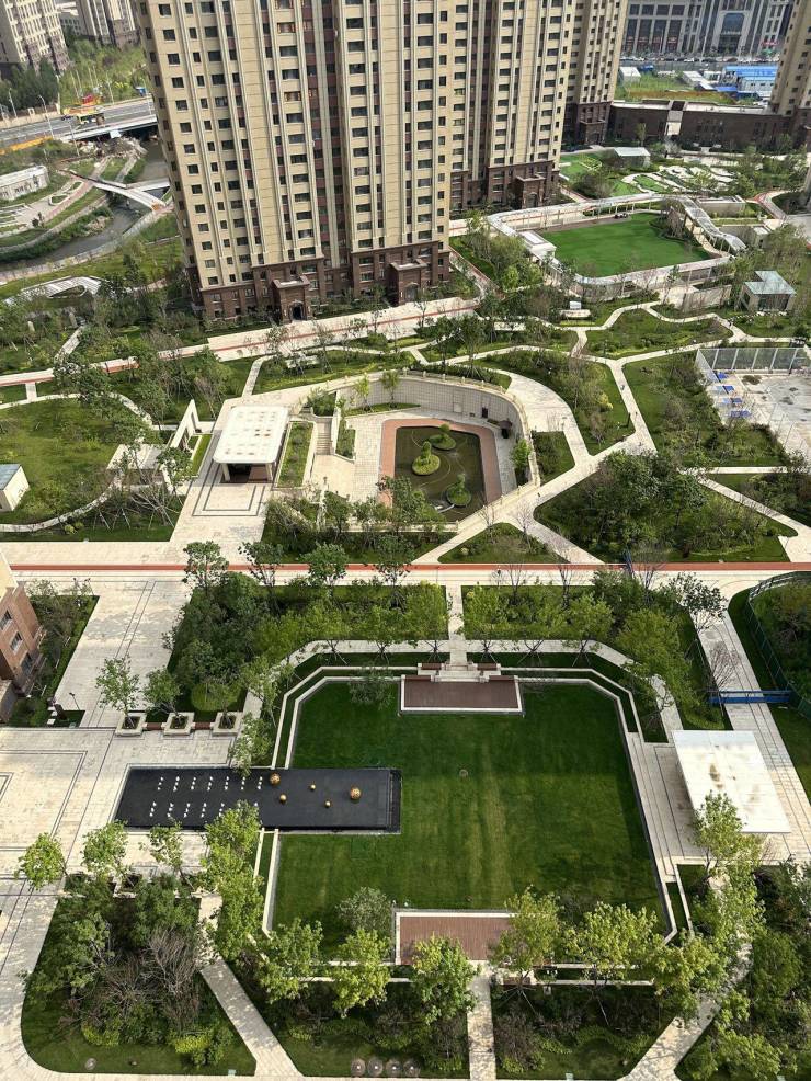 公园式社区规划,住宅建筑沿地块四周布局,留出充足空间,在社区中心形成围合式的超大公园庭院园林,供业主休闲放松。