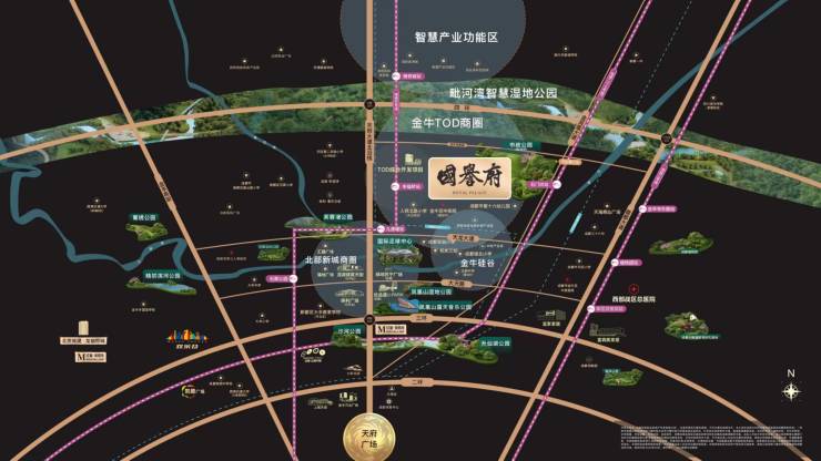 国誉府总占地约101亩,在金牛TOD旁,容积率仅 1.78低密住区,外享三大公园环幕视野,内拥一环两轴十二院园林景观,建面约 180-274m²花园跃墅,公园城市生活的理想诠释