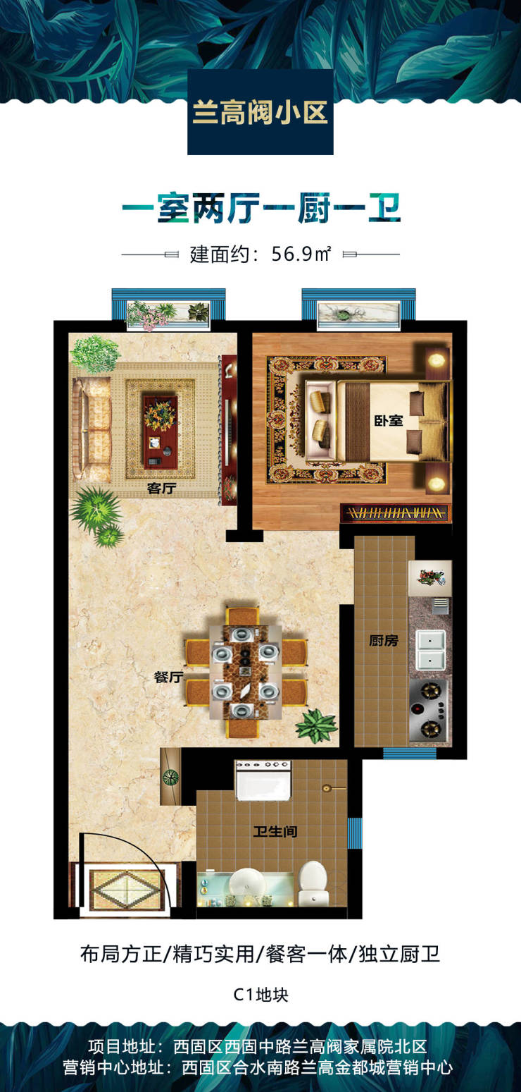 户型1 56.9㎡(一室两厅一卫一厨)东西北朝向