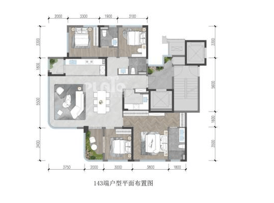 作为项目的入门级产品,约143㎡的户型即实现了功能完备的四房布局。得益于约110%的高得房率,其实质使用面积远超想象,空间感与实用性兼备,是高端圈层的入门之选与品质家庭的舒居典范。首批次将推售中间户与端户两种选择。