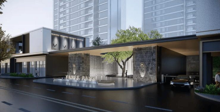 主入口采用门庭与景观一体化设计。超30米阔尺仪门与约5.6米挑高,采用深灰石材墙面与铝板顶饰,彰显尊崇气质;