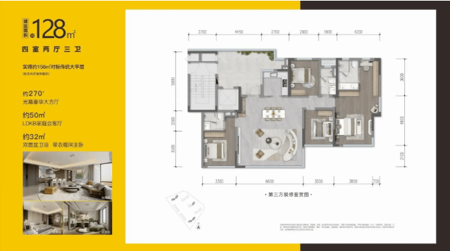 建面约128㎡四房三卫双套房