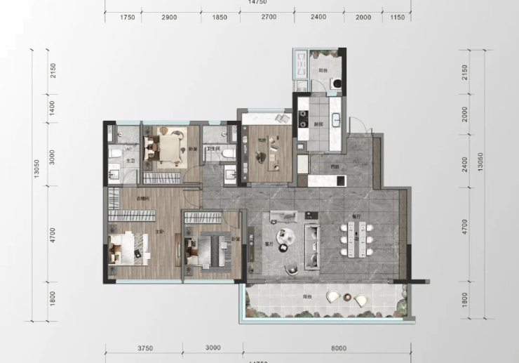 4. 户型尺度:彰显“阔绰高定”格调Trees Villa 项目的建筑立面风格独具匠心,给人带来不少惊喜。其精妙设计让窗外景观与室内空间自然融合,窗外景色恰似一幅毫无雕琢痕迹的画卷,顺畅无阻地与室内相连,为住户营造出“无边界”的居住体验,带来极佳的景观视野。就拿项目中的 143㎡户型来说,这是纯板式 1T2 扁平化墅级洋房户型。该户型不仅在空间布局上用心规划,在各个空间的尺度打造上更是把“阔绰高定”展现得十分到位。约 40㎡的宽敞横厅,搭配上约 8 米的阳台,极大地拓展了观景视野,完美呈现出“高改空间尺度”的独特魅力。其采用 LDKB 一体化的中西厨设计,还配备约 20㎡的双空中露台,全方位契合了家庭成员日常多样的需求。无论是烹饪美食、休闲放松还是娱乐玩耍,都能在这找到合适的空间,极大地提升了居住的舒适感与便捷性。尤其值得强调的是,酒店式奢居双套房设计极具人性化,充分从居住者的角度出发,在细节之处尽显人文关怀。居住者在享受高品质居住空间的同时,也能深深体会到家的温馨与惬意 。
