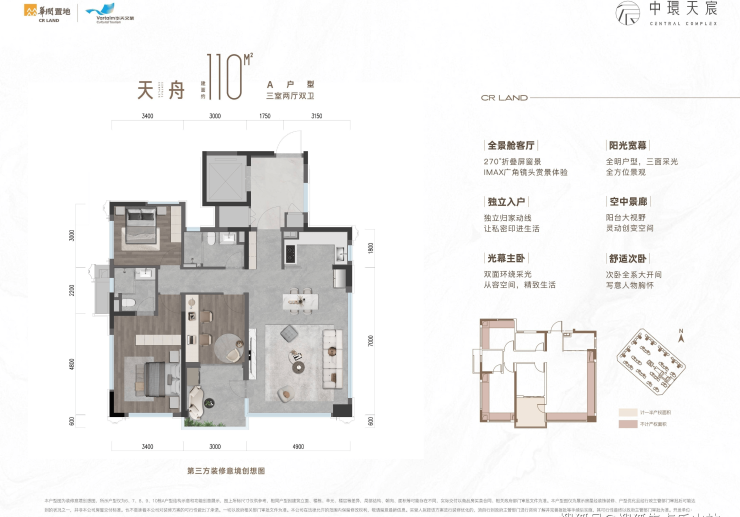 近 50㎡全景端厅:创新打造近 50㎡全景端厅,配合双向 270°、超 11㎡空中阳台采光花园,将室外景观引入室内,营造出通透豁达的空间感。同时,这种设计也形成了流动的洄游动线,提升了空间的利用率和居住的舒适度。