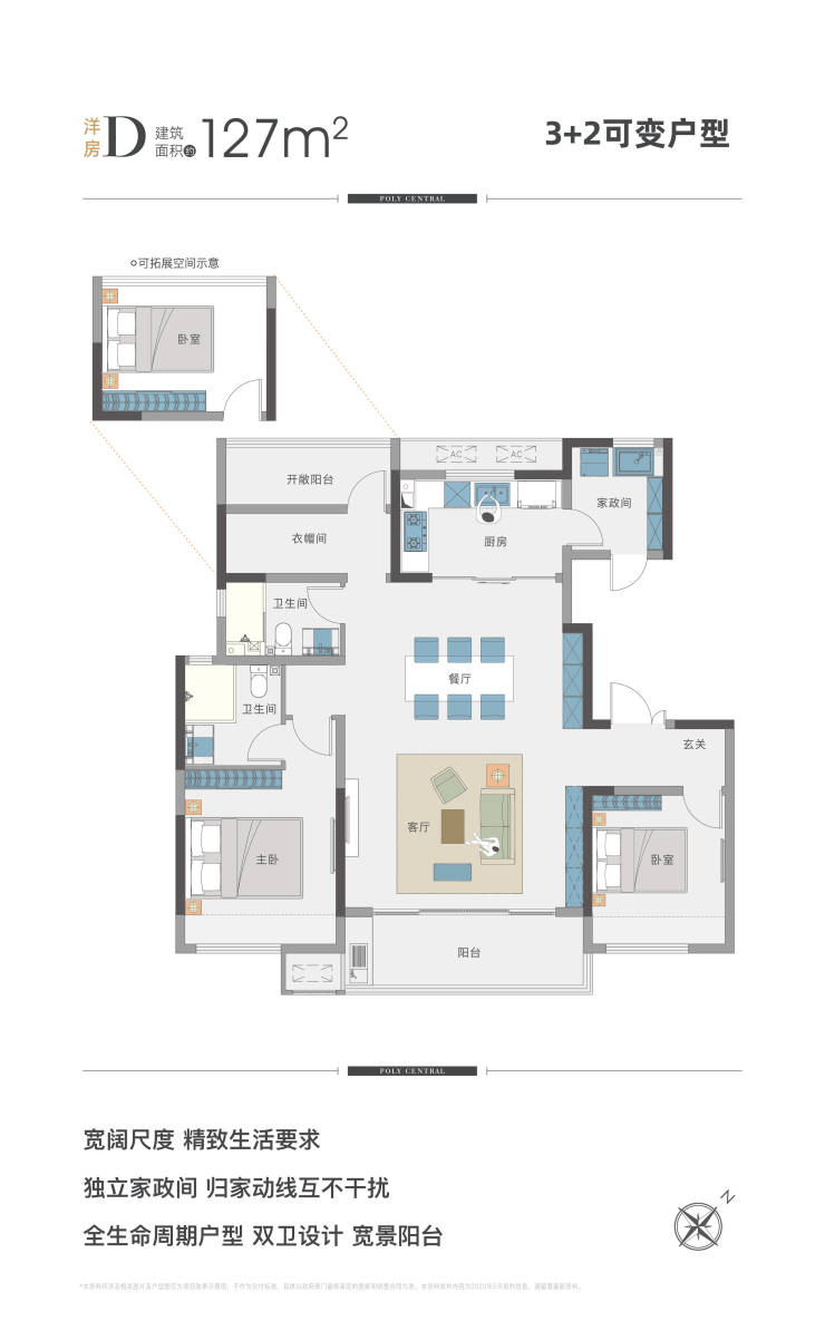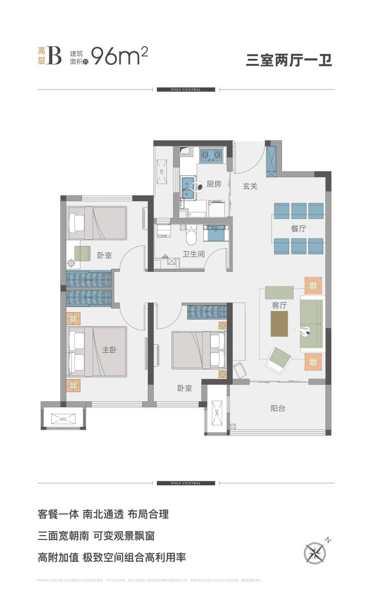 创新户型:高扩容空间,阳台和飘窗均可改造,可使用面积增加约11㎡,与同类型产品相比,同样的三室户型,可使用面积更多