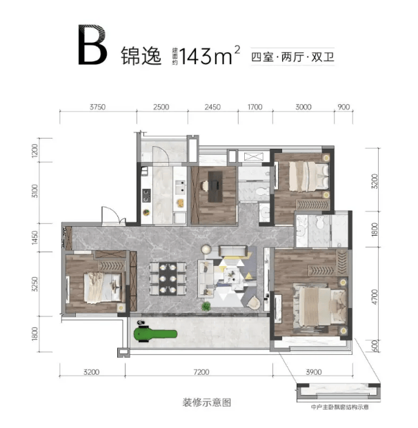 建面约143㎡四房户型