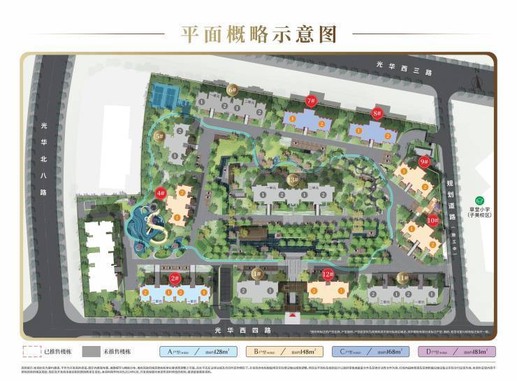【户型图+实景小区+小区配套】东西楼间距在140-195米,南北是最短处是36米和58米,这样的空间布局,这样的大中庭和楼间距,是外光华其他新盘所不具备的。