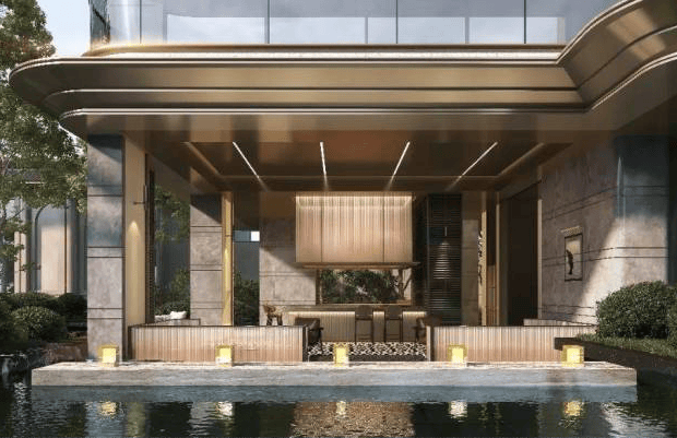 一方面是社区大门本身的升级,约31.4米长、8米高(仅为展示区已呈现的大门)的奢阔尺度,对称与开敞式的奢华环岛前场空间,与青岛路相接,可实现轿车环绕落客,超五星级酒店迎宾落客的尊崇感尽显;用材与设计也尽显高级,整体设计充满圆弧的曲线艺术,落客前场的仿铜色金属型材环岛屏风+两侧弧形仿铜色穿孔铝板+米白莱姆石设计,搭配雕塑与水景迎宾,顶部设计了仿铜色穿孔铝板星空顶,打造悬浮于璀璨“星空”下的豪奢归家体验。