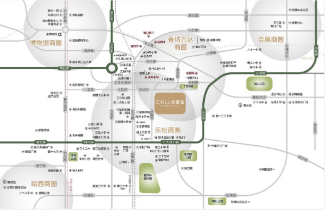 商圈叠加 主城荣耀满配關项目周边乐松、香坊万达、博物馆远大等商圈环伺,形成15分钟都市生活圈。风华中小学、九中等名校汇聚,植物园、劳动公园、中国亭园等绿意环绕;省医院、医大一院、市五院等三甲医院护航。国际会城市优质圈层,为优越生活增添砝码。