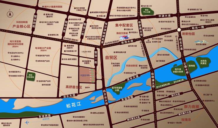 城市向北,生活向北,松北丨玫瑰湾·信园处于国家级新区、自由贸易试验区、高新技术产业开发区、经济开发区和行政区形成的五区叠加区位的核芯。目前,深哈金融科技城、国际经贸科技城、深圳(哈尔滨)产业园、数字冰雪产业生态建设示范区、中国北药智慧产业园、自主安全可控示范基地和东北亚国际贸易中心,七大重点产业强势落户新区,以加快建设国际化、现代化、生态化新城区。本项目与其中多个产业园区相邻,未来将为本项目带来更多优势和便利,发展不可限量。此外,本项目毗邻融创文旅城、枫叶小镇奥特莱斯、医大四院松北分院等成熟配套,繁华触手可及,生活、医疗等服务一应俱全。