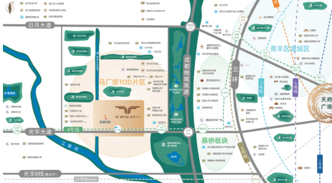 TOD示范引擎:项目是成都市首批14个TOD示范项目之一——马厂坝TOD的住宅部分。马厂坝TOD一体化设计范围达3000亩,将打造为集城市服务、新兴产业与改善居住于一体的区级新中心,项目深度参与并享受其发展红利。