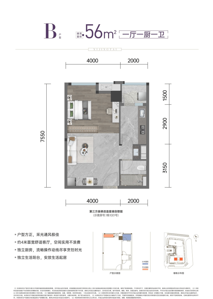 B户型:56㎡|一厅一厨一卫