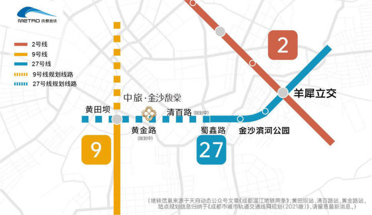 地铁27/2/9/4无缝换乘:距27 号线二期清百路站(规划中)约300米,两站可换9号线,10站通达金融城;4站实现与4号线“成都西站”换乘,4站可至羊犀立交换乘 2 号线,形成“主干道+地铁”的黄金交通配置。