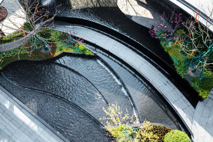 利用园区约4.5米地形高差,打造自然、艺术、奢华多维度极具品味的现代景观,形成一个背山面水、层叠交错、富于变化的美学艺术空间。