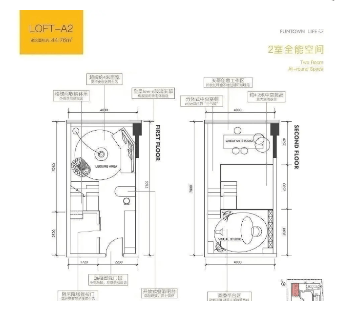 此方案侧重于满足小型工作室、自由职业者的办公需求。开阔的楼层空间可无障碍地划分出独立的办公区、会议区及展示区,7.8米的进深为创意陈列与团队协作提供了充足舞台,实现“下楼生活,上楼工作”的理想状态。】