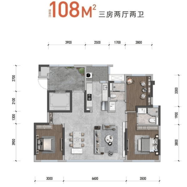 作为入门改善户型,以三室两厅双卫的配置,在紧凑面积内实现了功能完备。设计注重空间利用率,能满足年轻家庭或三代同堂的基本居住需求,是入驻核心区的高性价比选择。