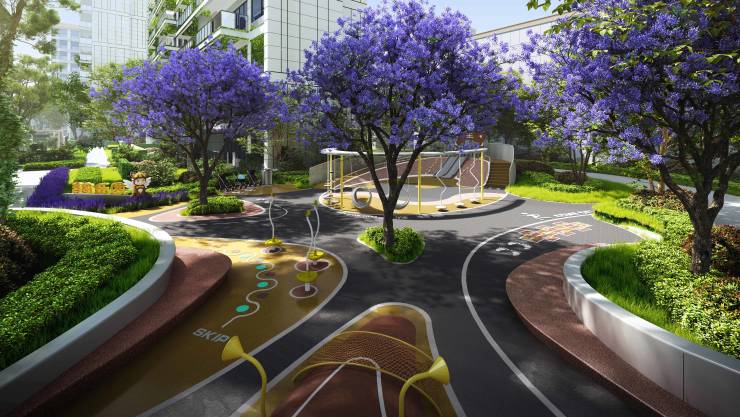 项目北侧代建城市公园长约260米,占地10102㎡,相当于24个篮球场面积,打造了6大主题花园,自东到西分别是街角花园、嬉戏乐园、草丘剧场、摩卡花园、大树花园和街角阳台,6大主题花园分别承载着西悦云庭业主不同的生活体验;