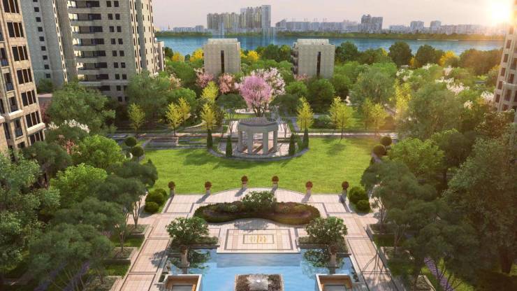通过酒店式大堂进入小区,映入眼帘的是约6300余平的园林示范区,其展示规模在经开项目罕见。汤湖观筑的园林绝对是其与众不同的亮点,项目整体容积率约2.3,放弃了传统的“排排坐”铺排,而是选择围合式布局,最小楼间距60米最大达到了110米,为业主提供更为舒适的居住环境。并且所有楼栋均为一个单元两梯三户,留出更多地面空间在社区中央造一座“公园”。园林展示实景: