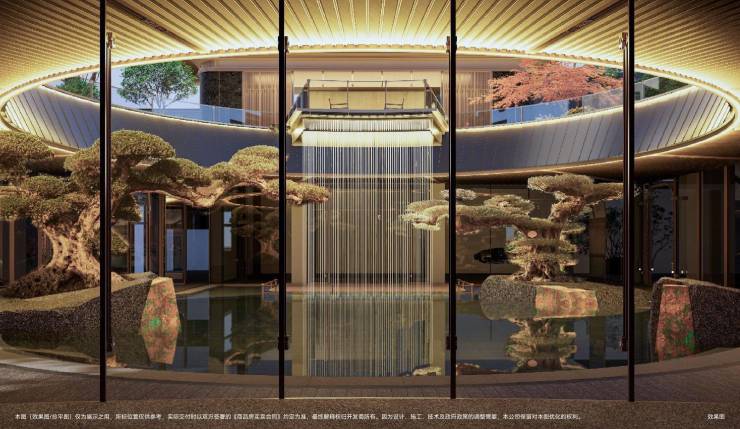 传承东方文化礼序,汲取《春江花月夜》与《四景山水图·春》等传世诗画名篇灵感,设计“三进门仪,园林九景”。一进高门大院,无雨迎宾;二进望湖水庭,游弋诗情;三进古树茶庭,漫步画境。同时融汇五庭四院,形成全围合式布局,呈现集诗意东方美学与当代人居审美、需求于一体的中式高端园境,真正做到“内得东方山水,外望大江大湖”。
