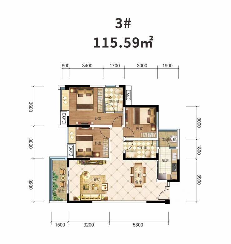 102㎡(3室2厅1卫):紧凑实用,适合小家庭,主卧带飘窗,次卧可灵活改造为书房。