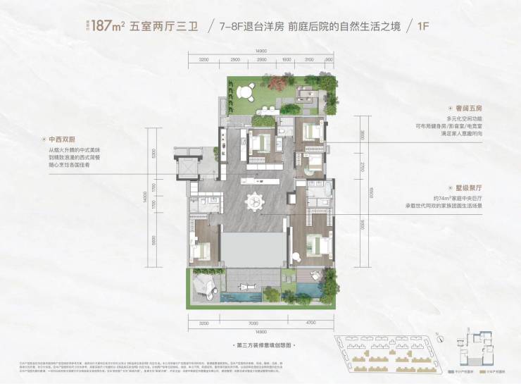 187㎡一楼带前后花园实得面积(花园面积前50平后花园60㎡合计110㎡)总共实得310㎡;