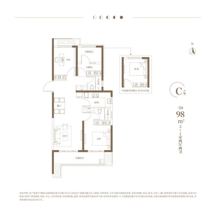 悦辰苑C户型:建面约98㎡2+1房两厅两卫