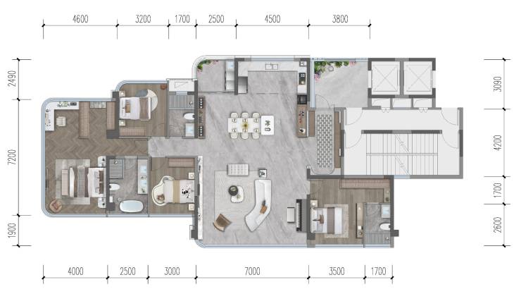 户型分析:楼尊视野 中庭楼王位置,尽享小区最佳中庭景观和超大楼间距,南北朝向,采光通风俱佳· 社交方厅约76㎡LDKB中央社交方厅,满足社交、聚会等场景,开放式中西厨+灵动导台· 越级享受开间超7米,媲美市场上250㎡豪宅尺寸感,超大会客厅尽显豪宅气派· 光厅入户约12㎡光厅入户,独立拼花玄关,双侧收纳空间,满足全家需求· 中西双厨厨房约4.5米超大开间,U型设计,中西厨联动,布局合理,尺度开阔· 星级套房星级双套房设计,洞悉家庭多元所需,约42㎡环幕主卧超大套房,行政级衣帽间尽显尊贵,独立式浴缸礼致峯范人生· 超大空间实际可利用空间约建筑面积的103%
