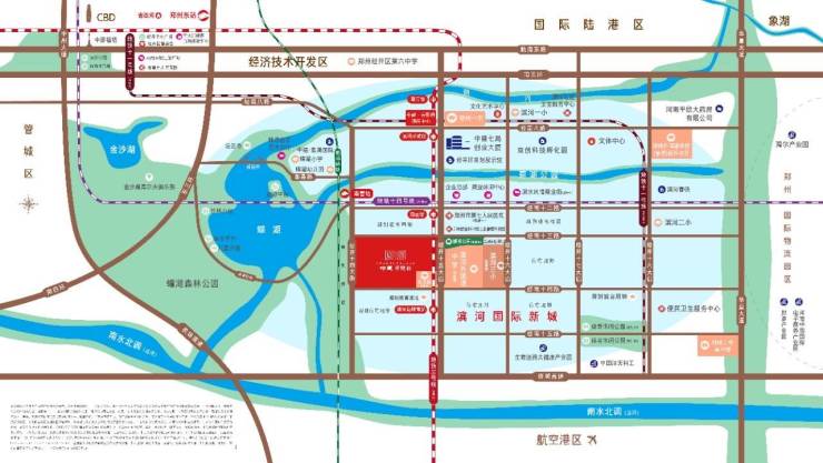 ①滨河中轴 宜居版面中建·元熙府择址崛起的东南副中心——滨河国际新城,占据大郑州双核发展要塞。作为郑州CLD中央生活区,滨河国际新城绿化率约56%,绿地面积约7000亩,水域面积约1460亩,还拥有海绵城市、综合管廊等高规格基建。区位图
