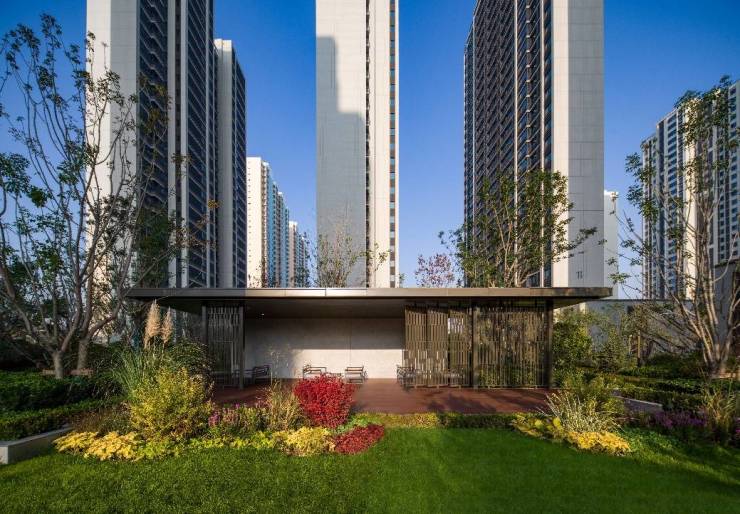 穿过风雨连廊,是层叠有序的山水美景,充分彰显归家的仪式感、归属感。社区内“一池三山”的景观布局传承创新于我国皇家园林的造园模式,在一片水域中安排三座绿岛,模拟东海神山仙境,寓意 “长寿康健,和谐富裕、平和安乐”。