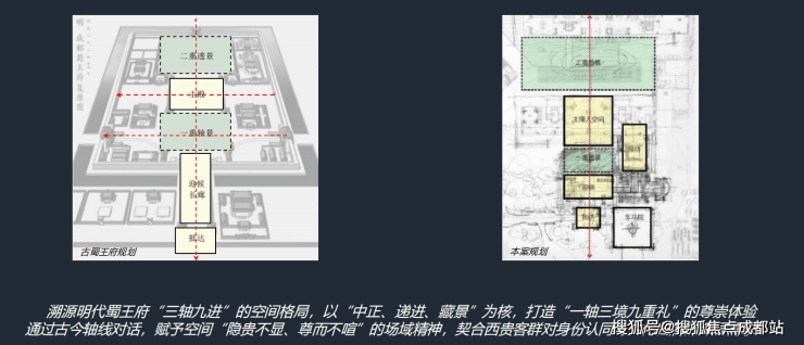 建筑规划与景观设计:采用蜀王府礼序形制,打造超级归家系统,提升归家仪式感。建筑布局上,多层台地与下沉空间结合,通过创新立体水院设计手法,搭配空中连桥、下沉庭院等,打造景观层次更丰富的立体社区,视觉上放大景观面积,营造出独特而富有魅力的居住环境 。