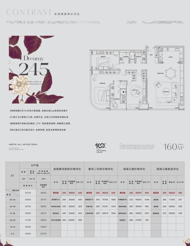 成都嘉佰道位于市中心绝版地段,百年川大望江楼隔江相望,千年锦江熠熠生辉,安顺廊桥,合江亭,东大街,九眼桥,占据历史文化的先机。以222米的绝版高度,塑造成都对话世界的居住高度。全国目前在售的最高双塔建筑,由阿玛尼大师亲制打造永久传世之作。城市封面的一张明信片。