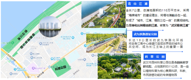 110万方武汉最美江滩+18公里世界级城市绿道前有被誉为“武汉最美江滩”的青山江滩,紧邻武九铁路遗址公园、市级园林科学公园。