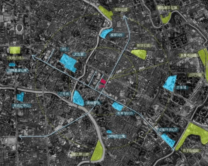 项目位于成都地理与文化的绝对核心——锦江区一环内东大街。这里不仅是三国传说“点将台”的所在地,更是世界最早纸币“交子”的诞生地。项目毗邻大慈寺、九眼桥等千年古迹,与太古里、IFS、春熙路现代商业顶流无缝交融,占据着成都历史文脉、金融起源与当代繁华三重意义上的唯一原点,其土地价值已非金钱可以衡量,是真正的“城市恒产”。