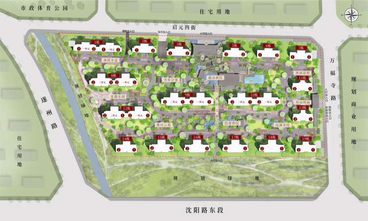 规划布局:18栋纯板式建筑呈阵列式排布,容积率2.0,最大楼间距达50米