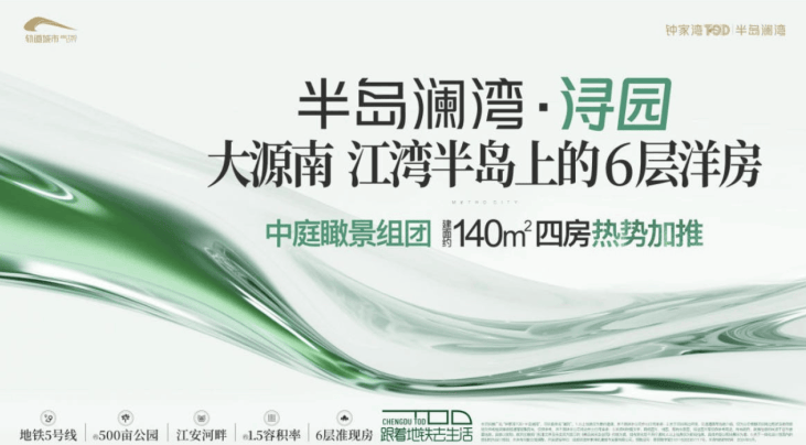 钟家湾TOD·半岛澜湾,雄踞大源南核心,是一座于千年江安河畔稀贵定制的低密滨水住区。项目独享约700米原生河岸线,与在建的约500亩三江公园隔水相望,将TOD(地铁5号线、19号线等四线环绕)的立体便捷与“推窗见河,出门亲水”的诗意栖居完美融合。社区规划为纯粹的6层纯板式洋房,户户南北通透,以140㎡奢阔四居等产品,敬献给追求繁华效率与自然静谧兼得的城市高阶家庭。