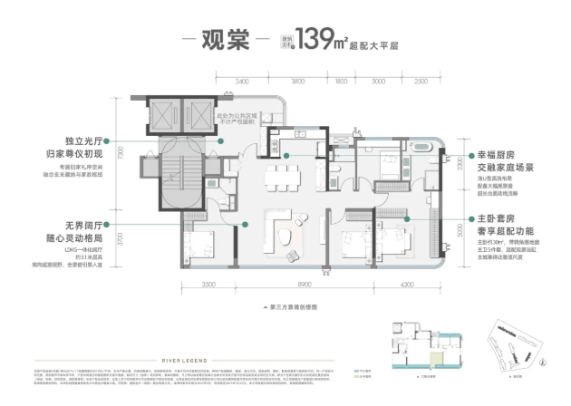 项目主打建面约139㎡与180㎡的精装四房产品,并以临河7层洋房为旗舰。所有户型设计均以最大化河景视野、营造奢阔空间感和强化家庭社交为核心,旨在打造面向清水河的“无界生活舞台”。